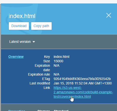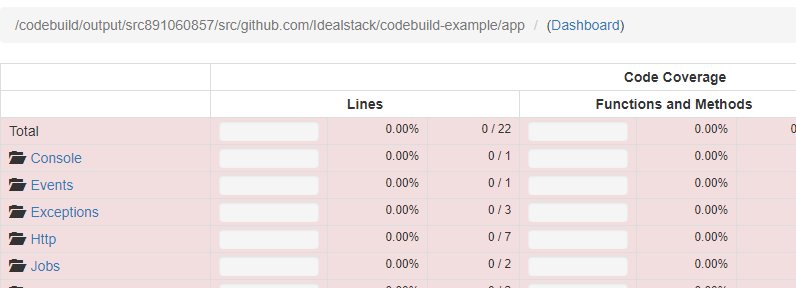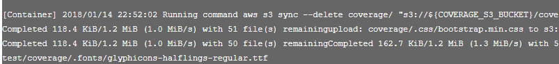 To get an html report on code coverage from your builds, first create a new s3 bucket to hold the report. Then update your build specification to use buildspec-3-coverage.yml.