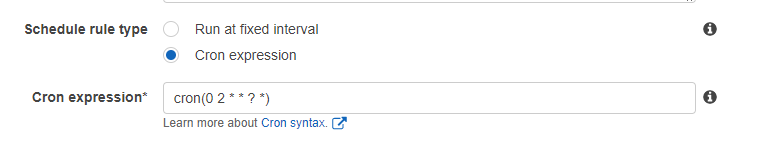 Enter an AWS Schedule expression for whent to run the backup. As an example, this will run the backup at 2am every morning