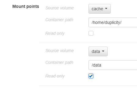 Under volumes : select the data volume and mount it to /data, select the cache volume and mount it to /home/duplicity