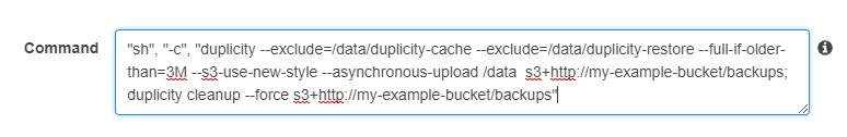 /bin/sh, -c, duplicity --exclude=/data/duplicity-cache --exclude=/data/duplicity-restore --full-if-older-than=3M --s3-use-new-style --asynchronous-upload /data s3+http://my-example-bucket/backups; duplicity cleanup --s3-use-new-style --force s3+http://my-example-bucket/backups