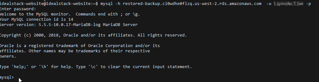 mysqladmin -h yourdatabase -u youruser -p create restored_database mysqldump -h restored-backup.ci0wdhe0flzq.us-west-2.rds.amazonaws.com -u youruser-p yourdatabase | mysql -h yourdatabase -u youruser -p restored_database