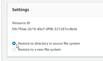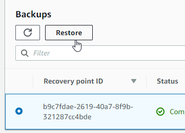 To restore a backup, go to ‘Protected Resources’ and find the resource you want to restore. Depending on what was deleted this could be either EFS (if you need to restore a file) or RDS (if you need to restore data out of the database)