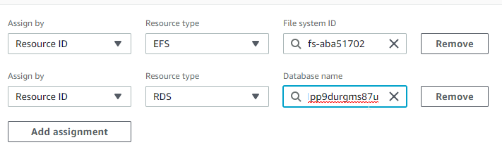 If you have your own stack you need to think about what resources you backup, but if you use Idealstack it is fairly simple - all your data is stored on EFS (for files) and RDS (for databases). So click Assign Resources. Then give your resource assignments a name