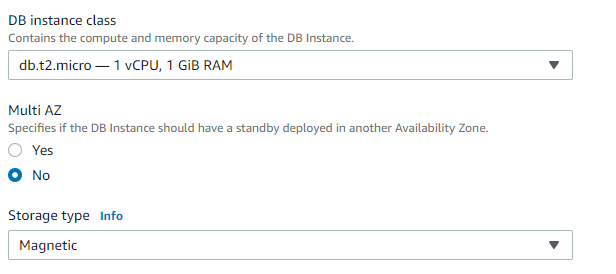 This process will create a new database instance based on the original. Most of the defaults on the next screen are sensible, except that because this database is only temporary and you are going to destroy it when you are finished with it, most of the time it makes sense to tweak the instance class, storage type and multi-az settings to cheaper options:
