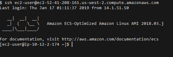 Once you’ve done this SSH to the instance as the user ‘ec2-user’. Note that if you have ssh’d to this machine before it’s host key may have changed causing ssh to give you an error. Editing ~/.ssh/known_hosts or running ssh -R