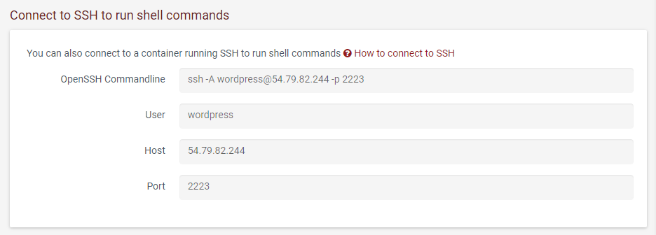 - SSH connection details are in the section Connect to SSH to run shell commands.