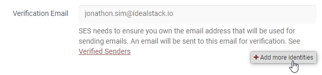 SES requires you to verify your sending addresses, in order to make sure no spam is sent through the system. You can verify individual email addresses or entire domains. In order to verify additional identities click the 'add more identities' button when editing your hosting plan.