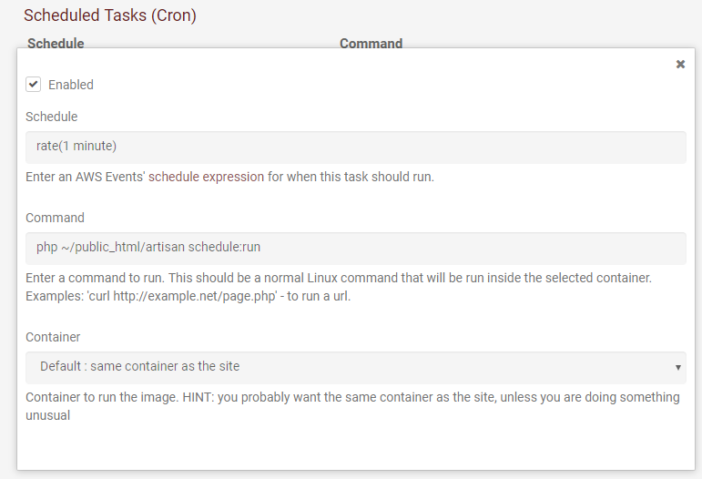 In your site settings enable a scheduled task like this to run Laravel's scheduled tasks and queued jobs