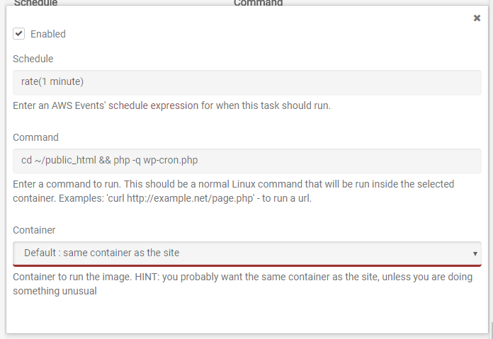 cd ~/public_html && php -q wp-cron.php - For the container, choose to use the same container as the site