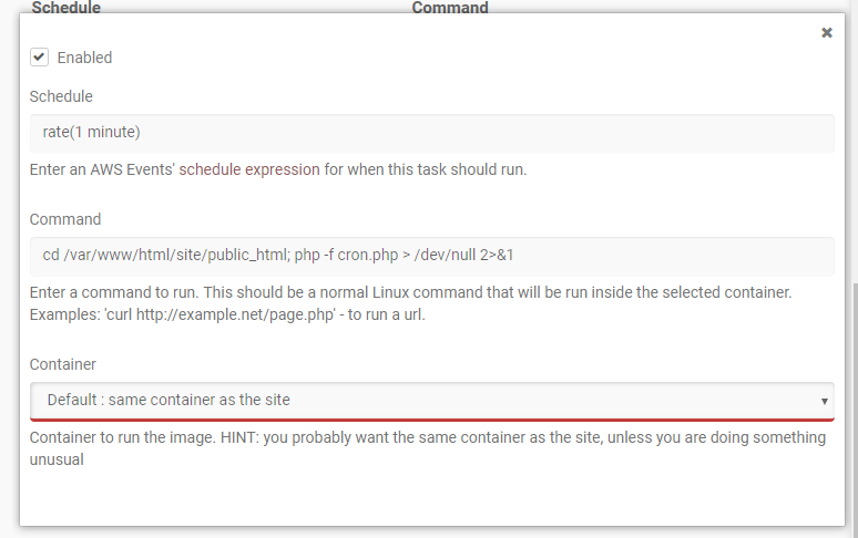 SuiteCRM requires some cron scripts. This is easy to setup in the site settings. Edit the site and under ‘Scheduled Tasks’ click ‘Add’ and enter details as below: